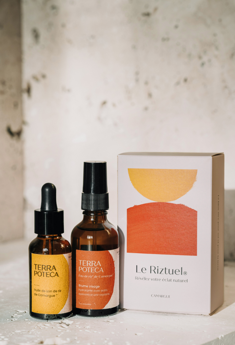 Le Riztuel comprend, une eau de riz de camargue formulée dans une brume hydratante, ainsi que l'huile de Son de riz qui hydrate et protège la peau.